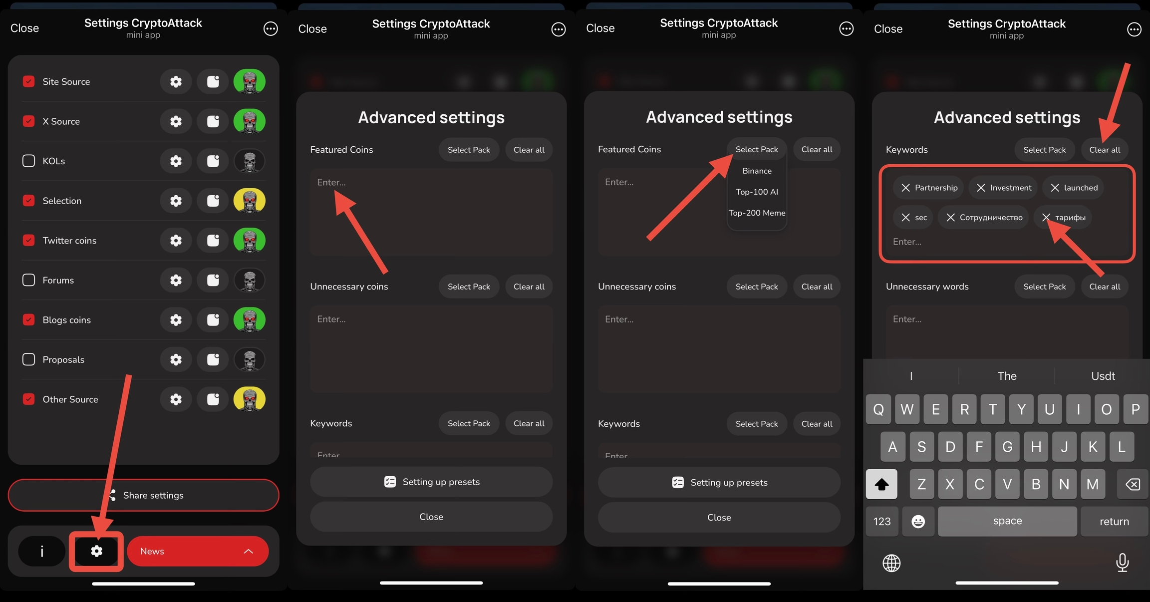Create lists of favorite coins, unwanted coins, and keywords to use when configuring each category. Combining different filters will help you eliminate noise and use valuable information more effectively!